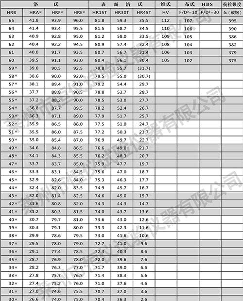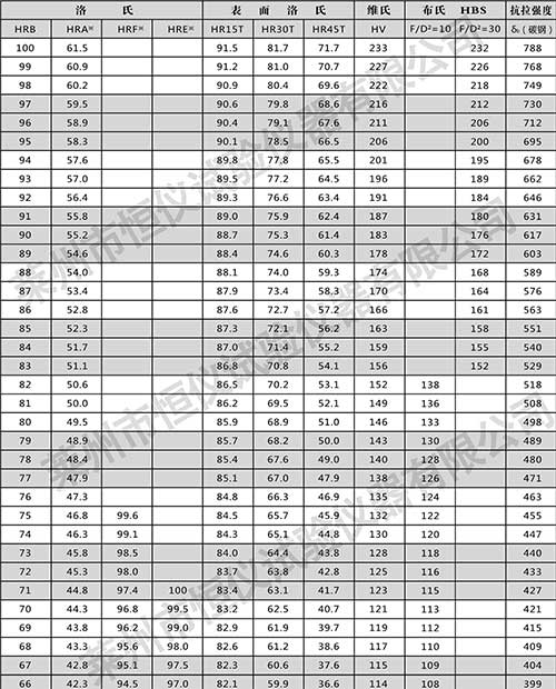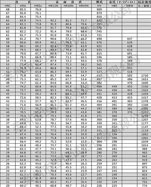 以下是常用范圍的鋼材抗拉強度與維氏硬度、布氏硬度、洛氏硬度的對照表。?