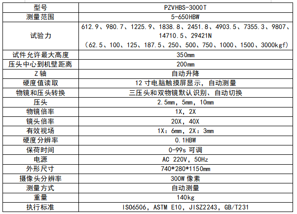 摘要: PZVHBS-3000T高級(jí)視覺全自動(dòng)布氏硬度計(jì)內(nèi)置觸摸屏,微型電腦,使參數(shù)設(shè)定、結(jié)果顯示更加直觀,操作更加便捷,也避免了顯微鏡的光源給眼睛帶來(lái)的刺激和視覺疲勞,減少了測(cè)量誤差。選擇相應(yīng)的標(biāo)尺開始后,硬度計(jì)將自動(dòng)選擇壓頭及物鏡,平臺(tái)自動(dòng)上升,施加完試驗(yàn)力后自動(dòng)回到聚焦面,壓痕清晰顯示并自動(dòng)測(cè)量,實(shí)現(xiàn)了布氏測(cè)量的全自動(dòng)化。 產(chǎn)品介紹: 1.機(jī)身使用優(yōu)質(zhì)鑄鐵一次澆鑄成型,配合以汽車烤漆處理工藝,外形圓潤(rùn)美觀; 2.一鍵式操作、全自動(dòng)測(cè)量; 3.同時(shí)具備了3個(gè)球壓頭及兩組物鏡,測(cè)量不同的試樣時(shí),不再有頻繁更換壓頭的煩惱,光學(xué)結(jié)構(gòu)嚴(yán)密、放大倍率高,使所需觀察的表面非常清晰; 4.自動(dòng)升降平臺(tái)采用精密結(jié)構(gòu),平穩(wěn)性高,開始測(cè)量后自動(dòng)上升,施加完試驗(yàn)力后自動(dòng)回到聚焦面,直接進(jìn)行測(cè)量,實(shí)現(xiàn)了一鍵自動(dòng)化的功能; 5.內(nèi)置CCD圖像自動(dòng)測(cè)量系統(tǒng), 觸摸屏操作顯示, 可預(yù)置試驗(yàn)力保持時(shí)間、顯示測(cè)量壓痕長(zhǎng)度、硬度值、硬度值的測(cè)量范圍、測(cè)量次數(shù)等等; 6.硬度測(cè)試結(jié)果可生成WORD或EXCEL報(bào)表,可直接保存或外接打印機(jī)輸出,方便用戶日后翻閱研究; 7.具有軟件硬度值修正功能,可以在一定范圍內(nèi)直接對(duì)硬度值進(jìn)行修正; 8.可自動(dòng)進(jìn)行全硬度標(biāo)尺的單位轉(zhuǎn)換; 9.電子閉環(huán)控制施加試驗(yàn)力,完全實(shí)現(xiàn)了加荷、保荷、卸荷的自動(dòng)化運(yùn)行; 10.精度符合GB/T 231.2、ISO 6506-2和美國(guó)ASTM E10標(biāo)準(zhǔn)。 應(yīng)用范圍: 1、測(cè)定黑色金屬、有色金屬及軸承合金材料的布氏硬度; 2、硬鑄鋼、鋁合金、銅合金、可鍛鑄件、軟鋼、調(diào)質(zhì)鋼、退火鋼、軸承鋼等。 技術(shù)參數(shù):